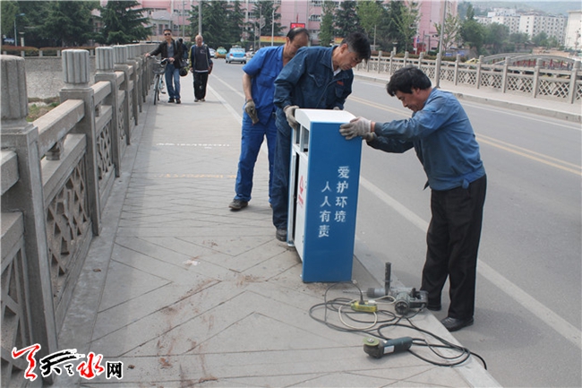 ????為在伏羲文化旅游節(jié)期間向游客展示天水市干凈整潔、靚麗溫馨的城市面貌,連日來,秦州區(qū)環(huán)衛(wèi)處對(duì)合作路、青年南北路等范圍內(nèi)破損、掉漆的1000余個(gè)果皮箱進(jìn)行維修、重新噴漆和噴繪宣傳標(biāo)語,后期還將陸續(xù)對(duì)全城區(qū)所有的果皮箱和400余個(gè)手推式垃圾收集車進(jìn)行油飾亮化,預(yù)計(jì)該工程將于6月12日前全部完工。(天水日?qǐng)?bào)記者 洪波 攝)