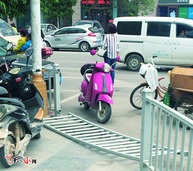 ????5月22日,記者途經(jīng)麥積區(qū)成紀(jì)大道東路和埠北路交叉的丁字路口處看到,成紀(jì)大道東路北側(cè)人行道拐彎處的一段護(hù)欄被撞倒,一半橫躺在人行道道牙上,一半倒在馬路上,周圍來往的車輛和行人不斷,有的行人為了圖方便,直接從倒下的護(hù)欄缺口處橫穿過馬路,這讓護(hù)欄不僅失去了它本來的作用,也影響了市容,希望有關(guān)部門盡快修復(fù)倒地的護(hù)欄。(記者馬楠 攝)