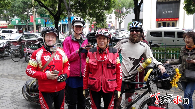 ????據(jù)陪同他們的天水老騎友光年和老頑童介紹:這兩位騎友來自英國,已由新加坡、馬來西亞、泰國等東南亞一路騎行,然后進(jìn)入中國。“昨天到達(dá)我市,受邀就住在了我家里,吃的是天水面片,至于交流,是由外地學(xué)外語的女兒通過手機的交流翻譯才了解到這些情況的?!本W(wǎng)名叫光年有著古道熱腸的老騎友自豪地說。