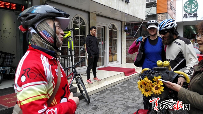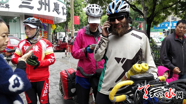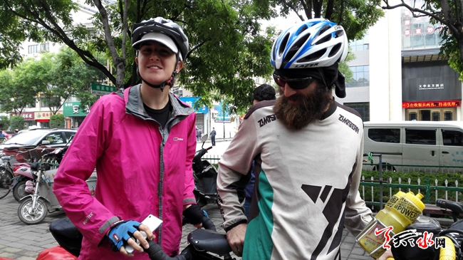 ????天天天水網(wǎng)27日12時訊【記者蘇中豹】5月27日上午,在秦州區(qū)解放路育生巷口捷安特自行車店前,一男一女兩名來自異國的洋騎友和他們重裝的加長雙人旅行自行車引起了天水騎友和路人的好奇,大家把兩位外國友人圍在中間,以各種方式,問長問短。雖然語言不通,大伙還是希望盡可能相互溝通,并想為他們提供幫助。