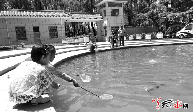 ????5月29日,兩位小女孩不顧危險(xiǎn),在麥積區(qū)馬跑泉公園水池邊伸網(wǎng)撈魚。六一國際兒童節(jié)期間,孩子們外出活動(dòng)增多,望各景點(diǎn)工作人員加強(qiáng)景區(qū)管理,家長看護(hù)好小孩,避免危險(xiǎn)事件發(fā)生。(天水日報(bào)記者 孫鎮(zhèn) 攝)