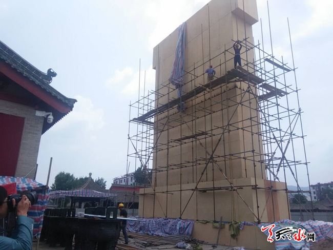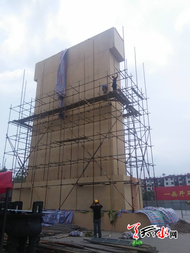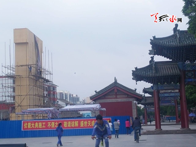 ????天天天水網(wǎng)31日19時(shí)訊【記者?何慧娟】5月31日,記者在伏羲廣場(chǎng)看到,伏羲大典主會(huì)場(chǎng)被藍(lán)色護(hù)欄圍住,耀眼的陽(yáng)光下,工作人員正站在高架上進(jìn)行施工。
