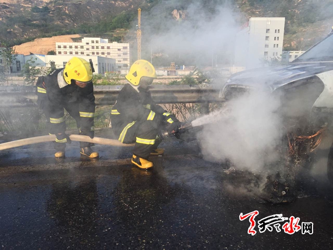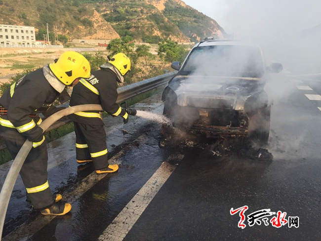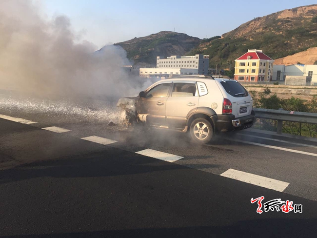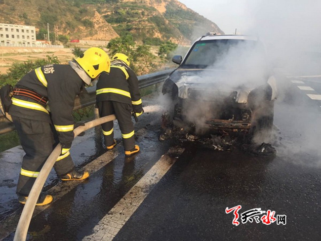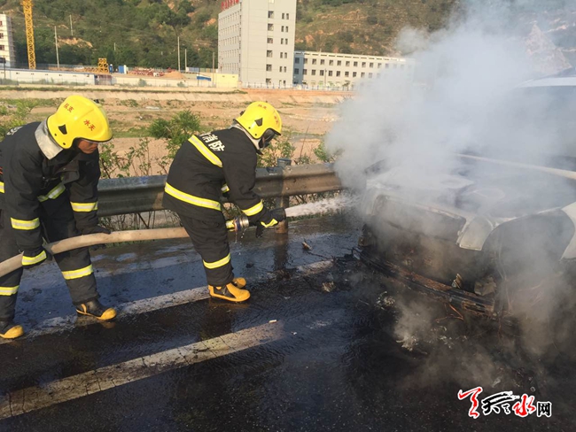????天天天水網(wǎng)31日19時(shí)訊 【記者?胡麗霞】5月31日18時(shí)28分,天水郡中隊(duì)接市119指揮中心調(diào)度稱:位于秦州區(qū)天定高速皂角鎮(zhèn)收費(fèi)站2公里處,一轎車自燃,車內(nèi)無人員被困,需立即處置。