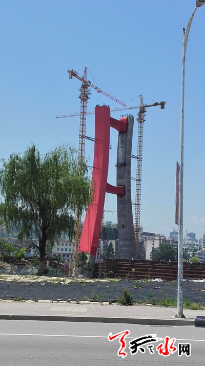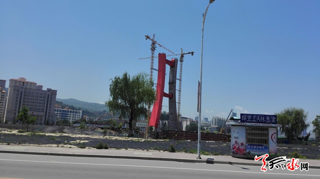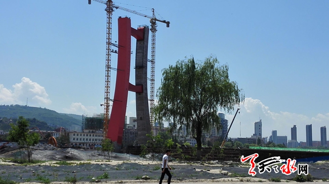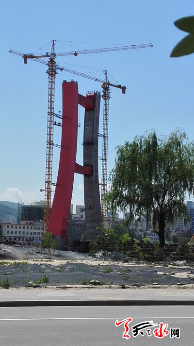 ????天天天水網(wǎng)12日17時訊 【記者 劉曉亞】 6月12日,藉河大橋橋塔在完成頂部和中部的鋼結構橫梁后,施工方開始給橋塔涂刷顏色,純正的品紅色在藍天與白云襯托下顯得十分耀眼,截至當天,只涂刷了橋塔東邊的一根立柱,預計未來幾天,整個橋塔將以美麗的容貌屹立在城市之中。