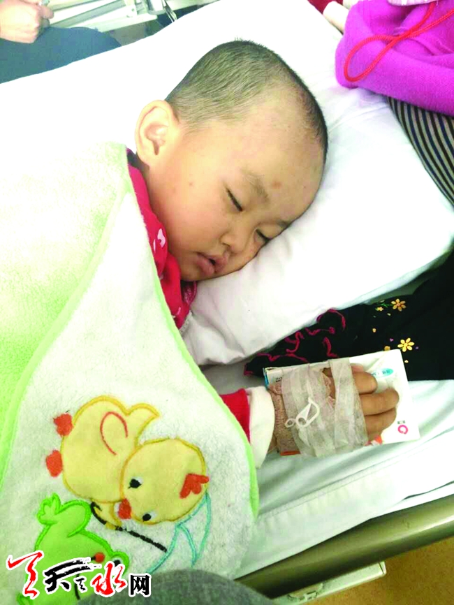 ????今年2歲的小女兒彤彤,腳上、腿上突然出現(xiàn)了小紅點(diǎn),手腕處有一塊淤青,剛開始吳小俊以為是孩子調(diào)皮磕碰所致。5月23日,彤彤的手指縫又出現(xiàn)紅點(diǎn),身上淤青也增加了幾處。當(dāng)天下午吳小俊就帶著孩子到武山縣人民醫(yī)院檢查,大夫經(jīng)過會診建議吳小俊到大醫(yī)院進(jìn)行進(jìn)一步的檢查。5月25日,吳小俊便帶著彤彤又來到蘭州大學(xué)第一醫(yī)院做進(jìn)一步的檢查。急性淋巴細(xì)胞白血病,結(jié)果像晴天霹靂一樣瞬間擊碎了吳小俊的心。吳小俊告訴記者,以前這個只在電視聽到的病他怎么也想不到會發(fā)生在自己孩子的身上。
