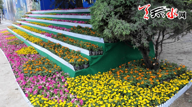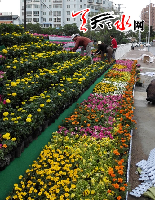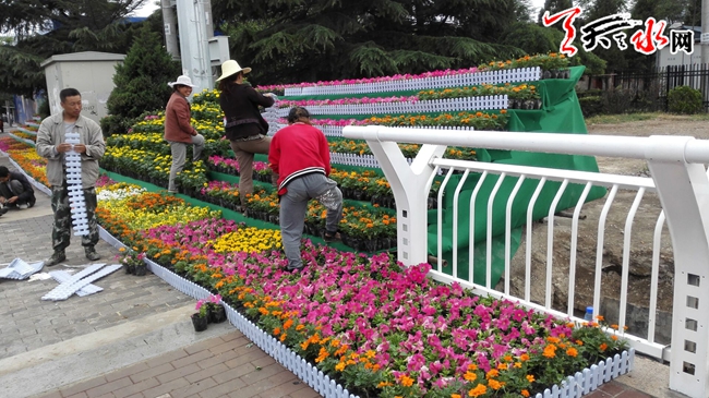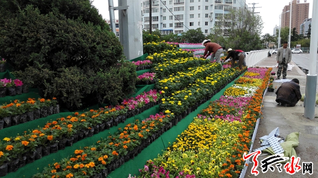 ????天天天水網(wǎng)21日15時(shí)訊 【記者 劉曉亞】6月21日,新建成的羅玉橋西頭,園藝工人正在擺設(shè)花壇,嬌艷的花朵,五彩色彩,與雄偉大氣的橋梁相映成輝,為節(jié)日的天水頻添了一道靚麗的風(fēng)景。