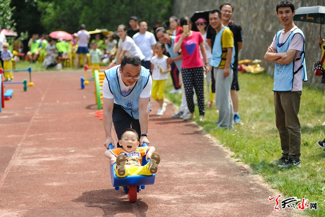 ????一對(duì)父子近日在秦州區(qū)3Q寶貝幼兒園的親子運(yùn)動(dòng)會(huì)上玩“爭分奪秒”游戲。近年來,天水市各幼兒園通過舉辦親子運(yùn)動(dòng)會(huì)等活動(dòng),讓孩子們學(xué)會(huì)感恩父母,增進(jìn)父母親與孩子的感情交流。(天水日?qǐng)?bào)記者 孫鎮(zhèn) 攝)