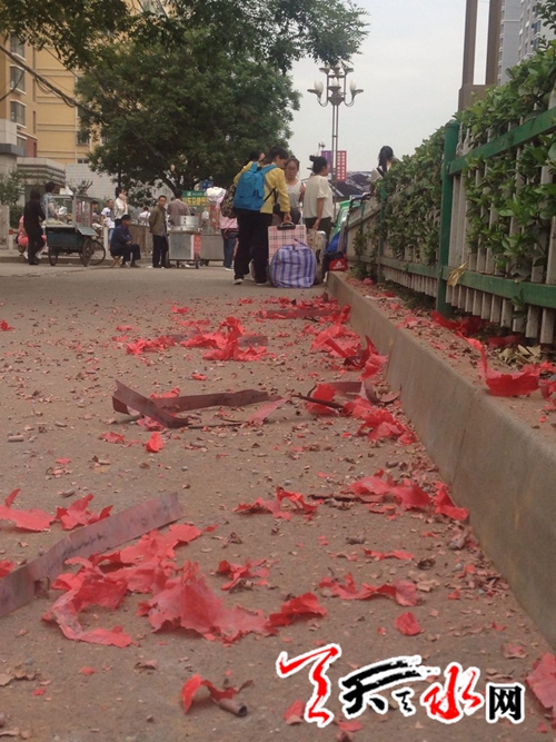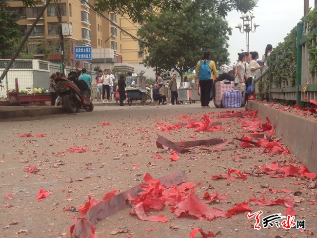 ????天天天水網(wǎng)27日10時(shí)訊 【記者張超】又到一年畢業(yè)季,2016屆的應(yīng)屆畢業(yè)生即將離開(kāi)校園走向工作崗位了,這的確是一件值得慶祝的事情,但僅僅吃頓“散伙飯”似乎還不足以表達(dá)同窗分離的惜別之情,于是有不少同學(xué)為即將離開(kāi)的同學(xué)點(diǎn)燃一串鞭炮,以示歡送,雖然“噼里啪啦”夠熱鬧,但留下的一地炮渣卻顯得不那么文明了。