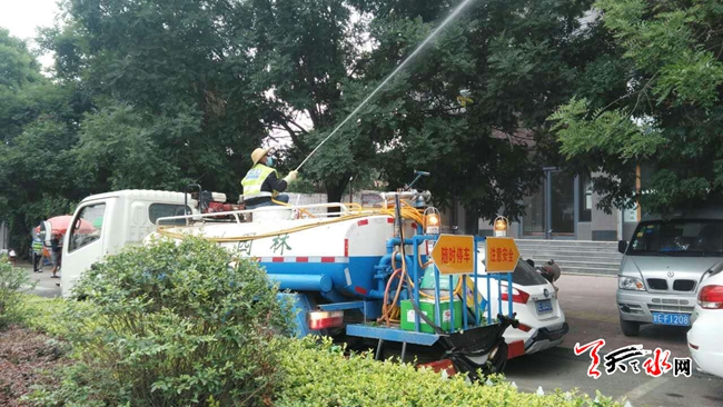 ????天天天水網(wǎng)27日18時訊 【記者 姬旺芳】6月27日,園林工人正在給秦州區(qū)南郭路行道樹噴灑農(nóng)藥,使行道樹免受病蟲侵害,切實做好綠化管護工作。