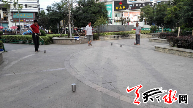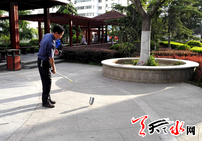 天天天水網(wǎng)6月27日19時(shí)訊(記者蘇中豹)27日傍晚,在夕陽的余暉中,位于秦州區(qū)重新街北邊的小廣場(chǎng)上,有幾位老人正揮舞手中的皮鞭,抽打著地上的一個(gè)個(gè)陀螺,高速飛旋的陀螺發(fā)出振動(dòng)空氣的翁翁聲,吸引著南來北往路人的目光。