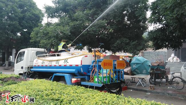 ????6月27日,園林工人正在給秦州區(qū)南郭路行道樹噴灑農(nóng)藥。夏季是樹木病蟲害高發(fā)期,近期秦州區(qū)園林部門對轄區(qū)范圍內(nèi)行道樹進(jìn)行“會(huì)診”,購買相關(guān)防治藥品噴灑,力爭將蟲害降到最低程度,保證樹木正常生長。(天水日報(bào)記者 何郁 攝)