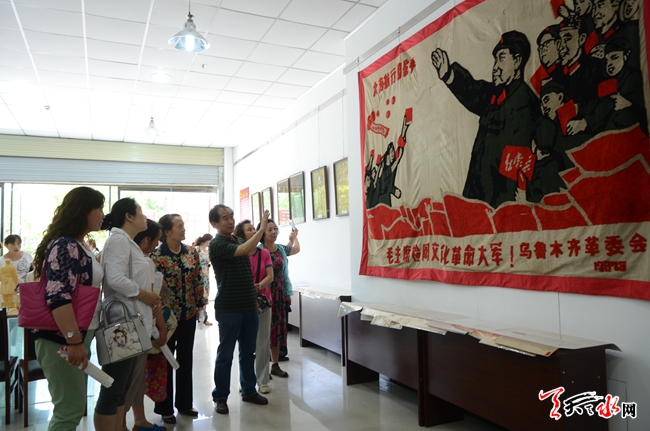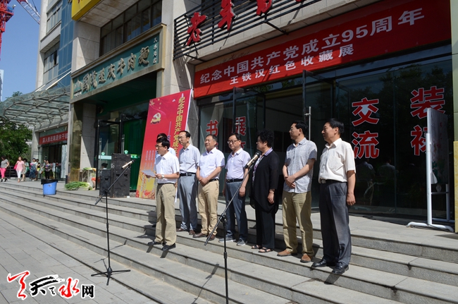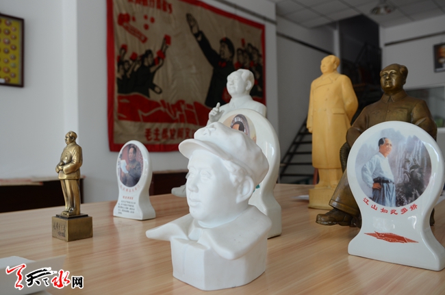 ????為紀念中國共產黨成立95周年,6月28日上午,由市委老干局主辦、市收藏協(xié)會承辦的王鐵漢紅色收藏展在天水金華大廈開展。此次收藏展共展出1000枚毛主席像章、200多份“文革”期間的報紙、16張偉人照片、11本毛主席掛歷以及部分雕塑、刺繡人像作品。(天水日報記者 楊璟 攝)