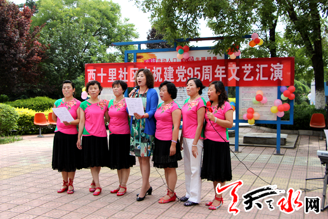 天天天水網(wǎng)訊(通訊員李小霞)在慶祝建黨95周年之際,6月29日上午,西十里社區(qū)計生協(xié)會在社區(qū)文化廣場,舉行文藝匯演,黨員代表、流動人口及居民群眾近200人歡聚一堂,載歌載舞。