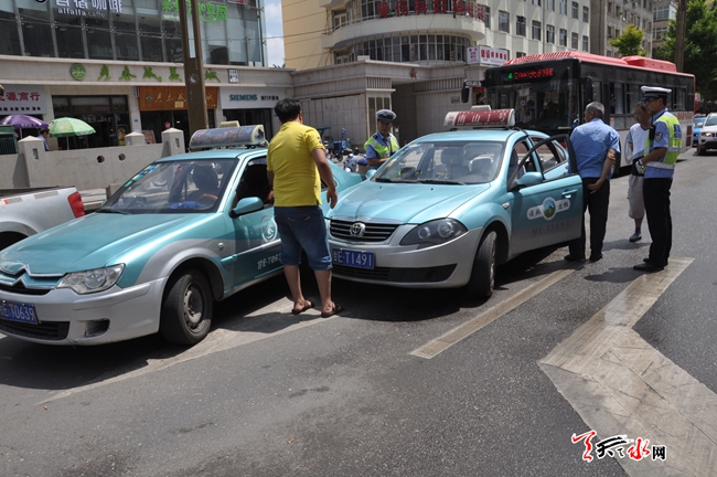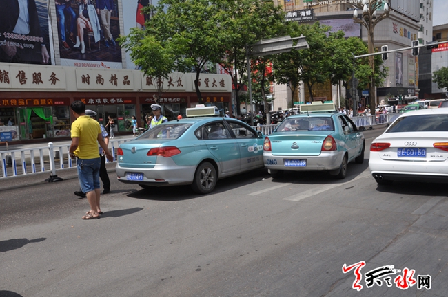 ????天天天水網(wǎng)4日12時(shí)訊【記者 常亮】7月4日中午,記者途徑秦州區(qū)民主東路時(shí)看到,在民主東路百貨大樓下的機(jī)動(dòng)車道中間,兩輛出租車發(fā)生剮擦緊挨一起,出租車一旁三兩個(gè)人爭吵不休。