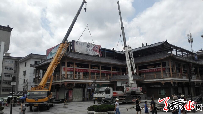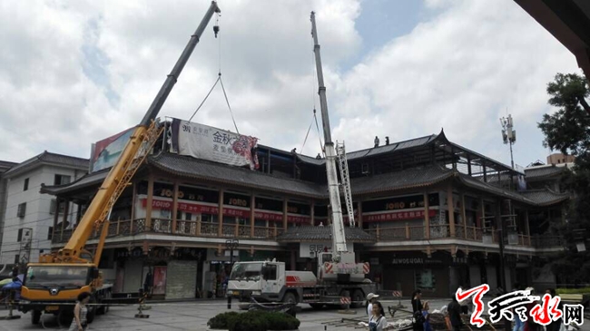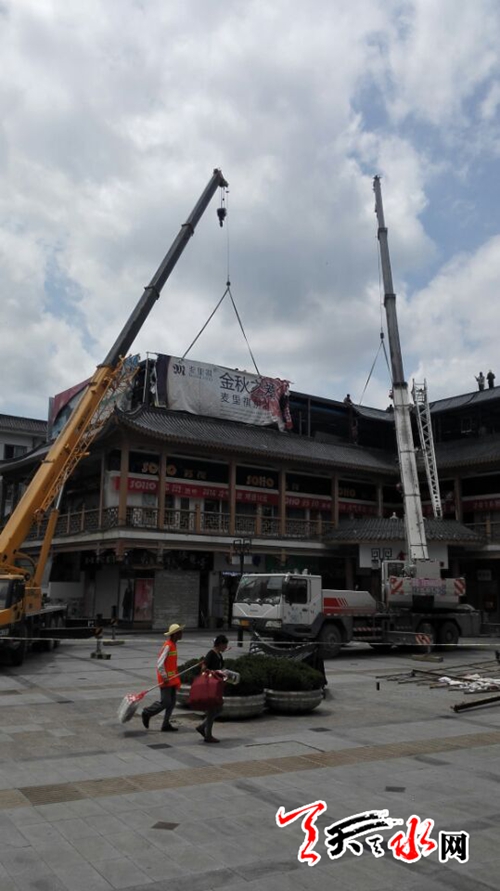 ????天天天水網(wǎng)5日14時(shí)訊【記者張文都?】7月5日,施工人員正在拆除秦州區(qū)步行街樓頂?shù)膹V告牌。據(jù)了解,步行街臨街樓體上的一些廣告牌因年久失修,存在安全隱患,施工人員將拆除這些廣告牌,并對(duì)一些樓體進(jìn)行維修改造。