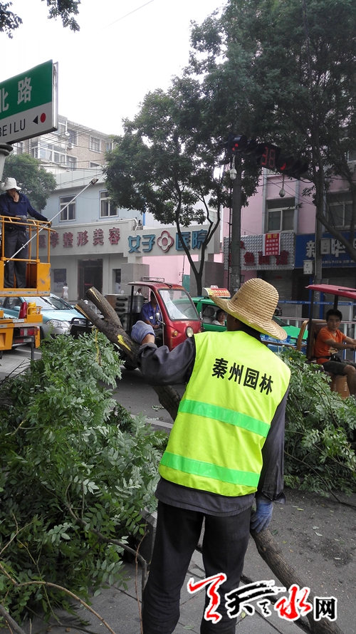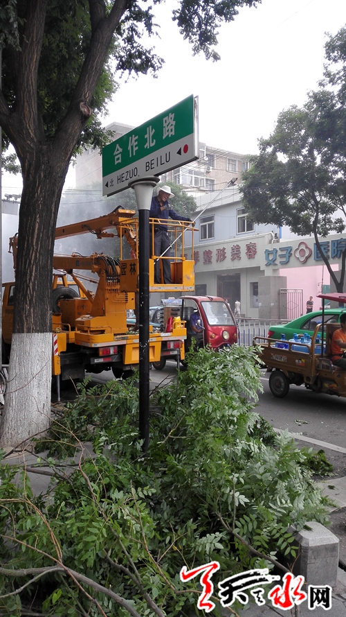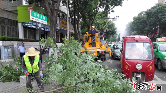 天天天水網(wǎng)7日11時(shí)訊 【記者 何永德】7月7日上午,秦州區(qū)園林管理處的工作人員正在合作北路修剪人行道上的樹枝,以確保道路行駛的暢通。