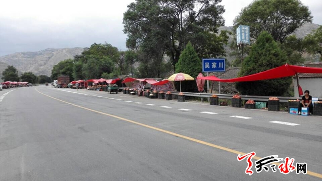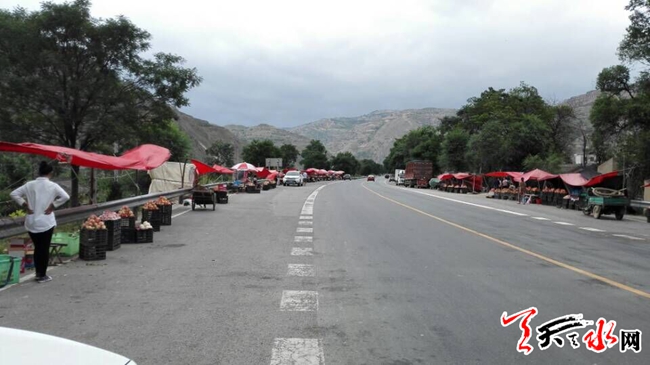 天天天水網(wǎng)8日12時(shí)訊【記者張文都 】公路邊擺攤設(shè)點(diǎn)一直被市民所詬病。盛夏時(shí)節(jié)正是果品上市季節(jié),然而記者在秦安縣西川鎮(zhèn)吳家川村旁的公路上看到,村民明目張膽在公路邊擺攤推銷果品,有人甚至搭建起“臥鋪”常駐路邊搞經(jīng)營,這里儼然成了雜貨批發(fā)市場。