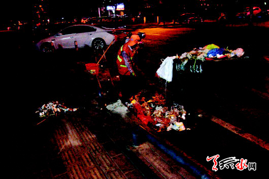 凌晨6:00,天已大亮??粗h(huán)衛(wèi)師傅辛勞的身影,看看整潔干凈的路面,記者心里不禁感嘆,誰能體會深夜里默默工作的環(huán)衛(wèi)工人,他們?yōu)橹冻隽硕嗌傩量嗟呐?才換來了白日路面的干凈,在此,呼吁商家搞好經(jīng)營的同時能夠搞好衛(wèi)生,也呼吁市民文明消費,愛護(hù)和珍惜美好的城市環(huán)境,別再讓夜市攤點上的垃圾弄臟了城市的“臉”。