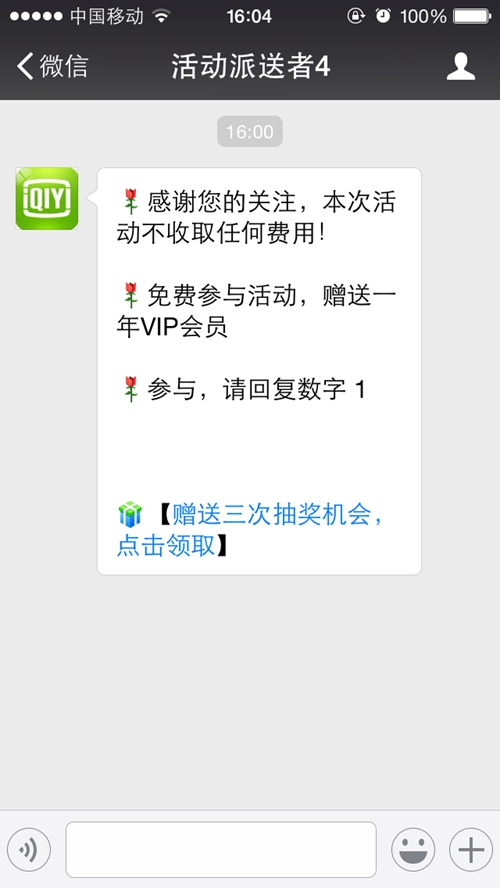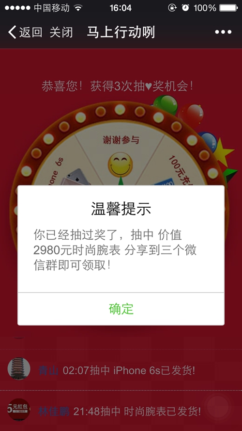 7月18日,記者打開(kāi)朋友發(fā)來(lái)的領(lǐng)會(huì)員網(wǎng)絡(luò)連接,在識(shí)別圖片中的二維碼后,網(wǎng)頁(yè)提醒記者關(guān)注一個(gè)名為“活動(dòng)派送者4”的公眾號(hào),在進(jìn)入該公眾號(hào)之后忽然轉(zhuǎn)到了一個(gè)抽獎(jiǎng)的頁(yè)面上,并且提示每個(gè)人有三次抽獎(jiǎng)的機(jī)會(huì),獎(jiǎng)品有100元充值卡、蘋(píng)果6S、時(shí)尚腕表等等的獎(jiǎng)品。隨后記者試著點(diǎn)擊轉(zhuǎn)輪抽獎(jiǎng),前兩次都是謝謝參與,但第三次抽獎(jiǎng)時(shí)提示記者抽中了一塊價(jià)值2980元的時(shí)尚腕表,并稱只要分享到三個(gè)微信群,并且留下聯(lián)系電話和地址之后就能領(lǐng)取該款手表,只需要支付49元的郵費(fèi),但是先等一下,說(shuō)好的愛(ài)奇藝會(huì)員免費(fèi)領(lǐng)呢?頁(yè)面再也沒(méi)有顯示過(guò)與其有關(guān)的內(nèi)容。