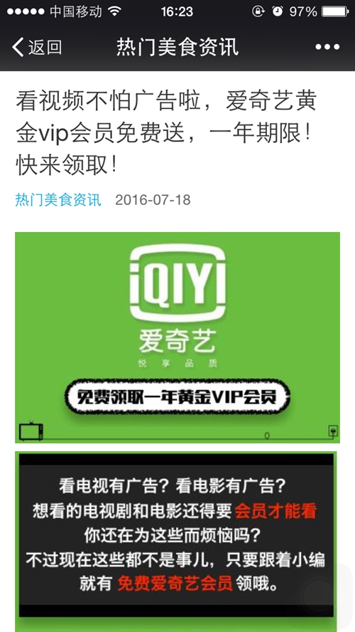 比起在電影院里看電影來(lái)說(shuō),這個(gè)價(jià)錢(qián)并不算貴,但這樣的商機(jī)也被一些別有用心的微信公眾號(hào)給盯上了,近幾日在我市的微信朋友圈里盛傳著“免費(fèi)領(lǐng)取愛(ài)奇藝一年黃金VIP會(huì)員”的網(wǎng)絡(luò)連接,記者本人的微信上也收到了這樣的鏈接,為了一探究竟,記者決定親身試驗(yàn)一下。