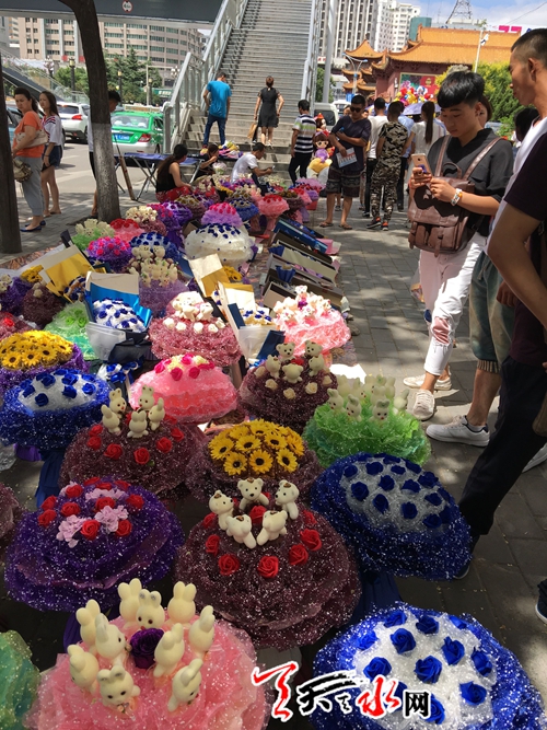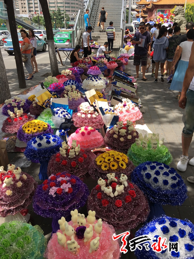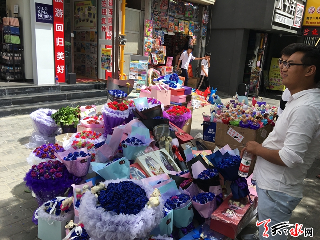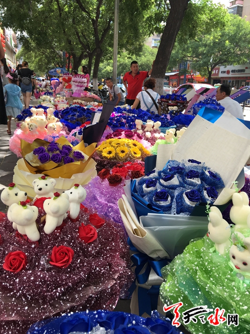 天天天水網9日14時訊【記者甄娜】今天是七夕節(jié),各式各樣的花束將秦州區(qū)大眾路形成了一條長長的花海,這些花束從四五百元到八九十元不等,賣花的攤主都稱,今年七夕花束價格比去年便宜,不過賣花的人比買花的人多,從早上十點擺攤到現在僅賣出了兩枝獨立包裝的單枝花,現在只能把賣花的希望寄托到晚上了。