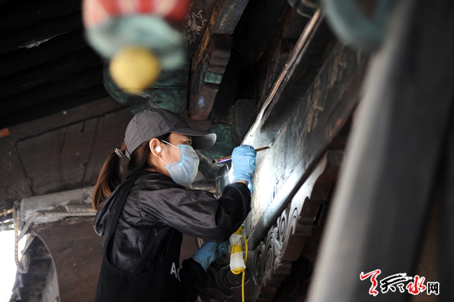 8月10日,工人正在對南宅子大門進(jìn)行保護維修。據(jù)了解,天水市博物館從去年起開始對南宅子建筑物的彩繪部分進(jìn)行修復(fù)保護,預(yù)計國慶節(jié)前完工。(天水日報記者周文濤 攝)