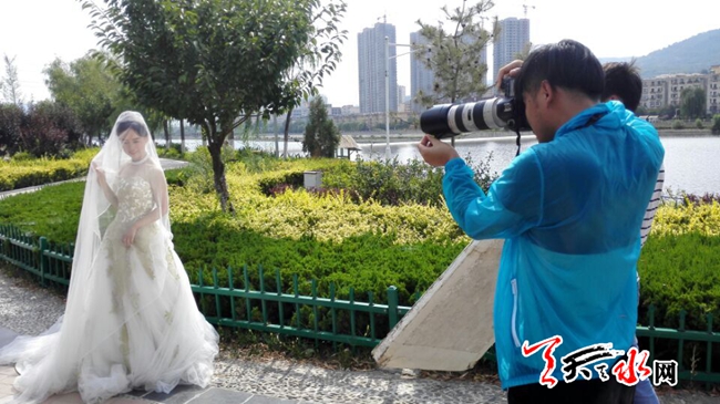 天天天水網(wǎng)16日11時訊【記者 張文都】天水湖獨具魅力的湖光風(fēng)情、完美詮釋了湖泊文化的悠長韻味,其湖天一色、綠意縈繞的景觀,浸透著濃郁的自然氣息與人文情懷,成為一道靚麗的風(fēng)景線。8月16日,一對對即將步入婚姻殿堂的新人甜蜜地依偎在一起選景拍照,定格美好瞬間,美麗的湖畔為他們今后的甜美生活開啟了幸福之旅。
