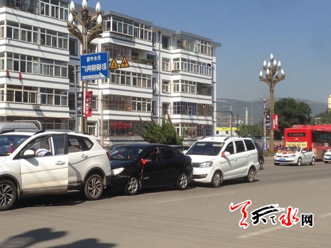 ????天天天水網(wǎng)訊【記者張超】9月8日是一個(gè)宜婚嫁的好日子,選擇在這一天結(jié)婚的新人不少,在我市街頭不時(shí)能看到緩緩駛過(guò)的結(jié)婚車(chē)隊(duì),但車(chē)隊(duì)多了難免就會(huì)出現(xiàn)一點(diǎn)小意外,記者在羲皇大道十里鋪路段就看到三輛車(chē)追尾的事故發(fā)生。