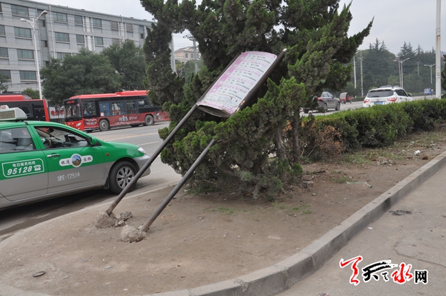 天天天水網(wǎng)21日14時(shí)訊【記者 常亮】9月21日上午,記者途經(jīng)天水市羲皇大道中路時(shí)看到,位于省工學(xué)院北處的公交站牌已經(jīng)斜躺在綠化帶中,公交站牌底部的水泥樁被連根拔出,傾斜的站牌講綠化帶內(nèi)的樹(shù)木壓彎了腰。