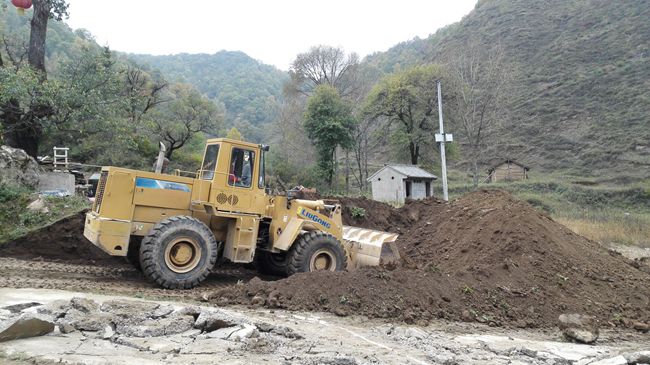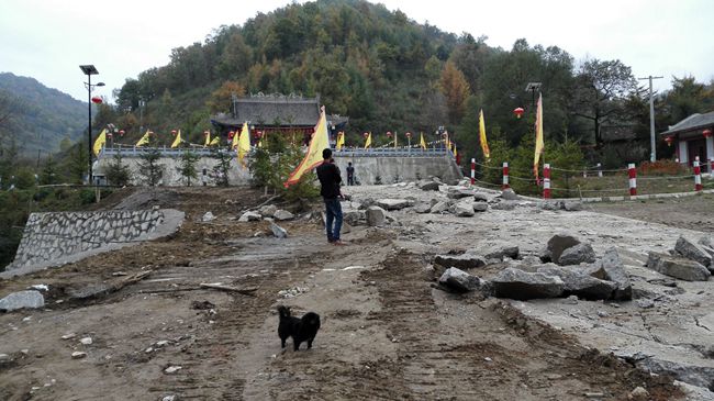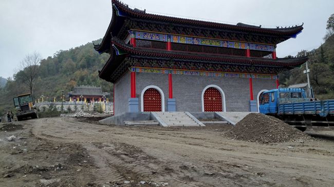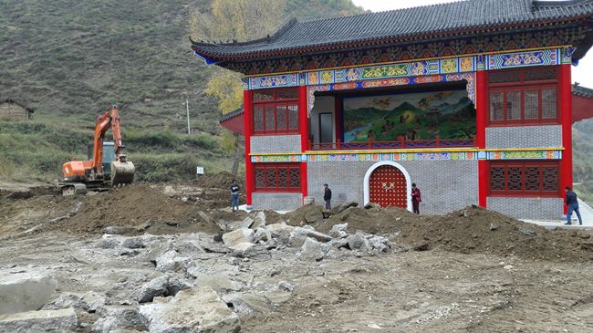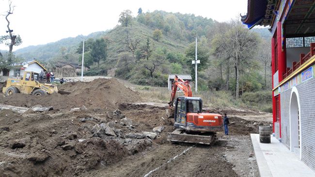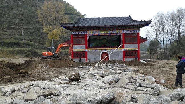 ????當(dāng)日下午,軒轅宮新建成的戲臺邊工地上施工車輛來來往往,裝載機(jī)挖掘機(jī)挖填著土方,一派繁忙。