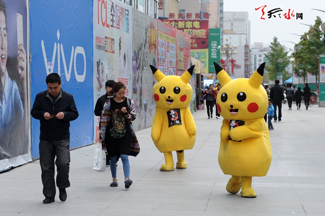 10月12日,兩個卡通人走上街頭為商家做宣傳,吸引得市民駐足拍照留念。(天水日報記者周文濤 攝)
