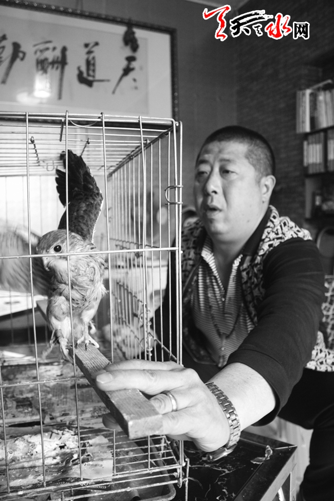 10月16日,聽聞謝良要將“候候”放歸自然的消息,記者聯(lián)系到了謝良,并在他家中見到了“候候”。因為怕過量運動傷到剛養(yǎng)好的翅膀,所以“候候”有一半的時間是關(guān)在籠子里的,盡管關(guān)在籠子里,但猛禽特有的兇猛神情卻一點不缺,一身花麻的羽毛油亮,彎彎的銳利鳥喙,銳利的眼神,雖然身處籠中卻依然如將軍般驕傲挺拔。