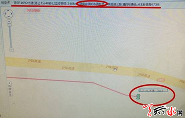 ????車去哪兒呢?這是案件偵查至此的關(guān)鍵點(diǎn),辦案民警根據(jù)視頻偵查的結(jié)果發(fā)現(xiàn):該車在當(dāng)日早上強(qiáng)行拽走金某后在城區(qū)內(nèi)轉(zhuǎn)圈,之后上了天巉公路,在中灘鎮(zhèn)稍作停留后返回麥積區(qū),下午2點(diǎn)40分左右朝甘泉方向駛?cè)ァ^k案民警根據(jù)掌握的所有信息進(jìn)行分析后確定犯罪嫌疑人很可能駕車上高速朝茹某的家鄉(xiāng)浙江湖州方向駛?cè)?。辦案民警到天寶高速公路管理處進(jìn)一步調(diào)查后發(fā)現(xiàn)該車輛已于2016年9月24日下午3時(shí)駛?cè)?span lang="EN-US">G30連霍高速并朝寶雞方向駛?cè)ァ?/span>????時(shí)隔近10個(gè)小時(shí),車能行駛到哪里?根據(jù)辦案民警初步判斷,10小時(shí)左右的車程嫌疑車輛很可能已經(jīng)駛?cè)牒幽鲜【硟?nèi),辦案民警立即聯(lián)系河南信陽(yáng)市指揮中心,并提供了該案件的詳細(xì)情況,信陽(yáng)市指揮中心立即對(duì)該車輛進(jìn)行研判并發(fā)現(xiàn)該車輛于9月25日0時(shí)27分已經(jīng)過(guò)信陽(yáng)市固始縣。
