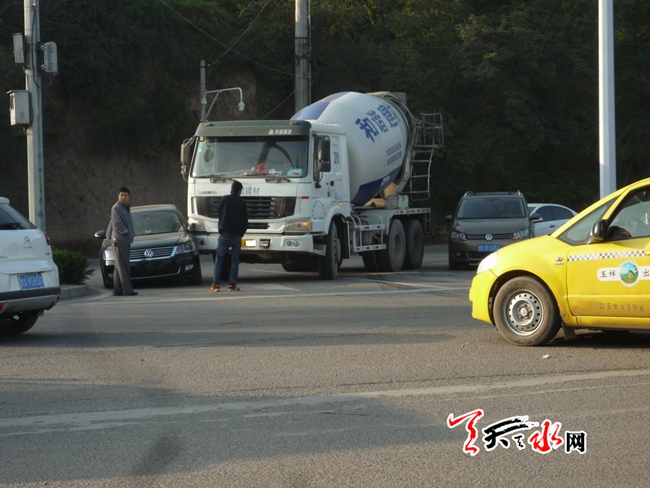天天天水網(wǎng)31日8時訊【記者蔚軍平】10月31日8時許,在秦州區(qū)迎賓橋南側(cè)路口,發(fā)生一起交通事故。一輛商砼車在轉(zhuǎn)彎時,其前右側(cè)與一輛黑色轎車的左側(cè)發(fā)生相撞,兩車均有不同程度受損。