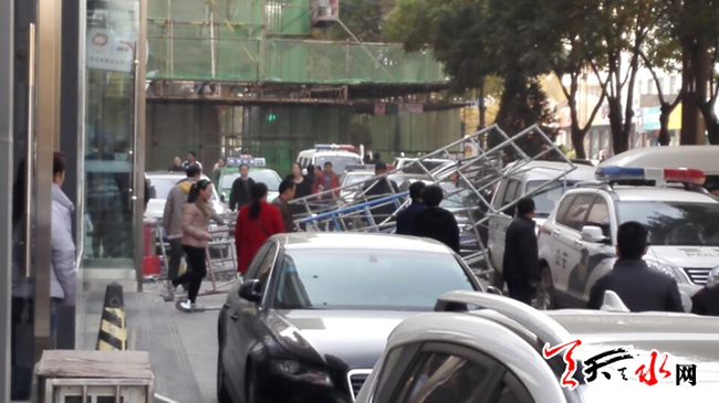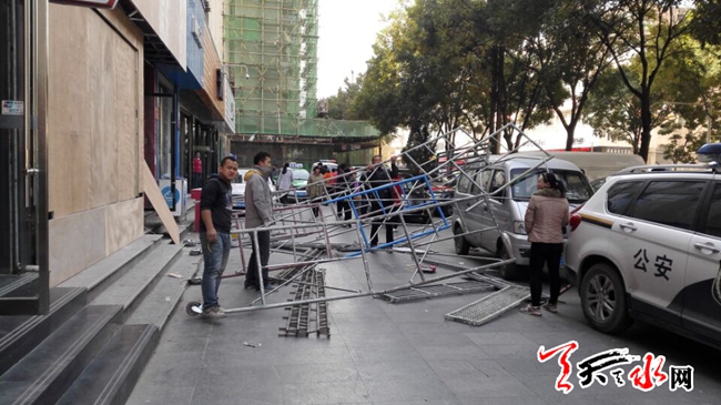 天天天水網(wǎng)14日17時(shí)訊【記者 楊曉斌】11月14日下午3時(shí)許,秦州區(qū)民主東路大城派出所附近,一個(gè)裝修店面門(mén)頭的施工點(diǎn)上,搭建了三層的腳手架突然倒塌。隨著啪地一聲金屬撞擊地面的較大的聲響,腳手架散落一地,兩名施工員應(yīng)聲掉落在地面。所幸掉落在地人員并未受傷。天天天水網(wǎng)在此提醒,施工同時(shí),要把安全擺在首位。