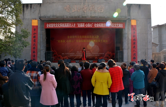天天天水網(wǎng)訊【記者?姬旺芳?實(shí)習(xí)生?徐媛】省秦劇團(tuán)原副團(tuán)長(zhǎng)、戲劇“梅花獎(jiǎng)”得主、國(guó)家一級(jí)演員竇鳳琴在秦州區(qū)玉泉鎮(zhèn)瓦窯坡村演唱《龍鳳呈祥》,這是省委宣傳部通過(guò)開(kāi)展“送節(jié)目”的形式,開(kāi)展宣傳文化系統(tǒng)高層次人才“走基層?心連心”活動(dòng)。
