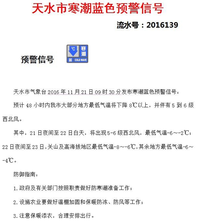 天水市氣象臺(tái)11月21日9時(shí)30分發(fā)布寒潮藍(lán)色預(yù)警信號
