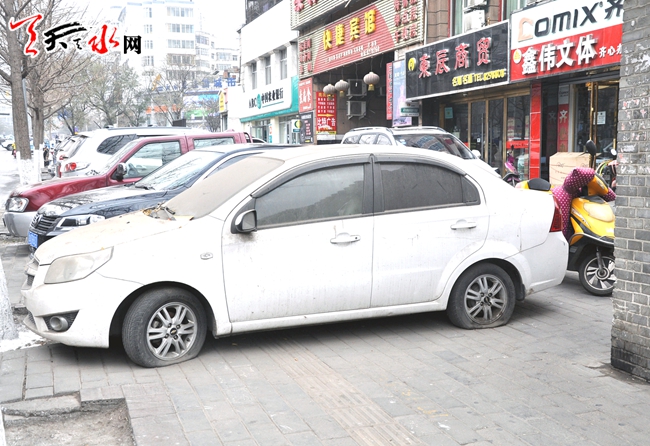 隨后記者來到秦州區(qū)青年北路東側(cè),同樣看到一輛沒有車牌的白色小轎車停放在人行道上,車身滿是塵土,四個輪胎都空癟著沒氣。由于這輛車緊鄰一堵墻,路人通過此處時沒法直行,只得繞其拐個彎通行。