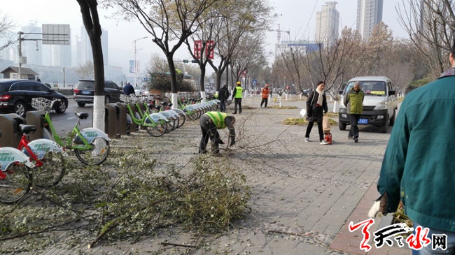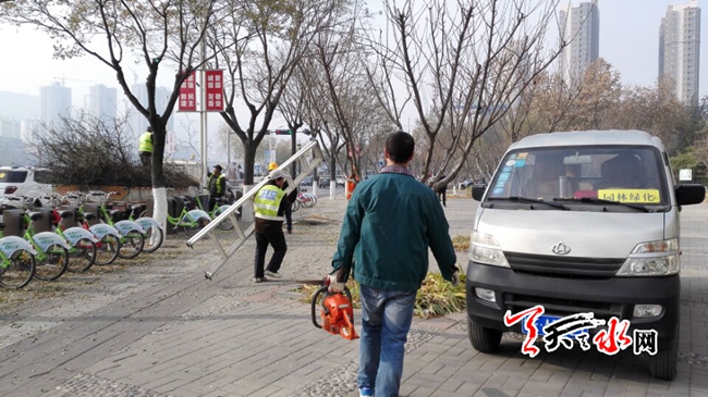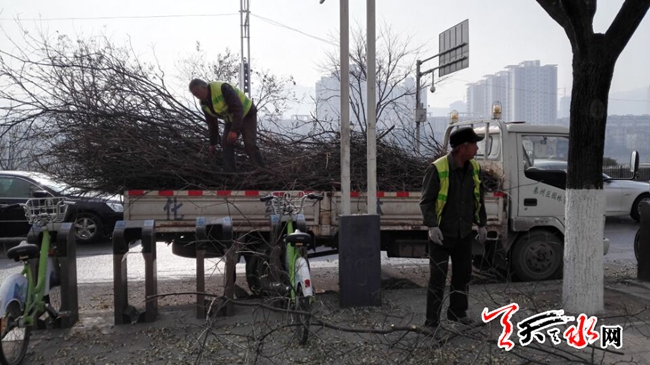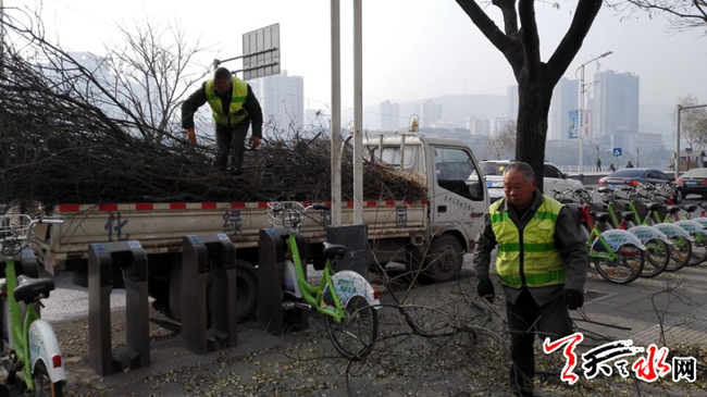 天天天水網(wǎng)9日11時訊【記者 蘇中豹】當日午間,在秦州區(qū)環(huán)城東路,秦州園林處的工作人員正在給行道樹剪枝。其中一位工人告訴記者:目前他們是在給城區(qū)行道樹進行冬季修剪,這樣開春后樹木會更加健康,同時剪除多余枝丫,排除安全隱患。