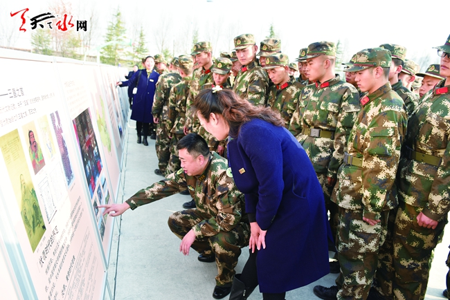 12月13日下午,武警天水市支隊官兵正在觀看市博物館流動展覽《一畫開天 肇啟文明——人祖伏羲精品展》。當天,天水市博物館將最新伏羲文化原創(chuàng)流動展覽30多塊展板送進武警支隊,選派4名優(yōu)秀導游為該隊200多名官兵現(xiàn)場講解,讓武警官兵更加了解天水優(yōu)秀傳統(tǒng)文化。(天天天水網(wǎng)記者楊璟 攝)
