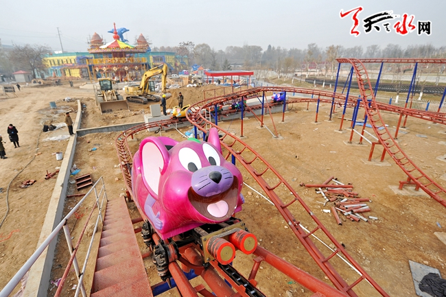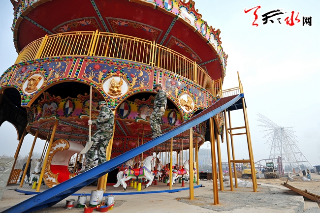 12月14日,工人正在安裝調(diào)試馬跑泉愛馬歡樂世界的游樂設(shè)施。擁有四環(huán)過山車、65米高摩天輪、大擺錘、雙層旋轉(zhuǎn)木馬等26套大型游樂設(shè)備的馬跑泉愛馬歡樂世界位于麥積區(qū)馬跑泉公園南側(cè),預(yù)計2017年初開園迎客。(天天天水網(wǎng)記者孫鎮(zhèn) 攝)