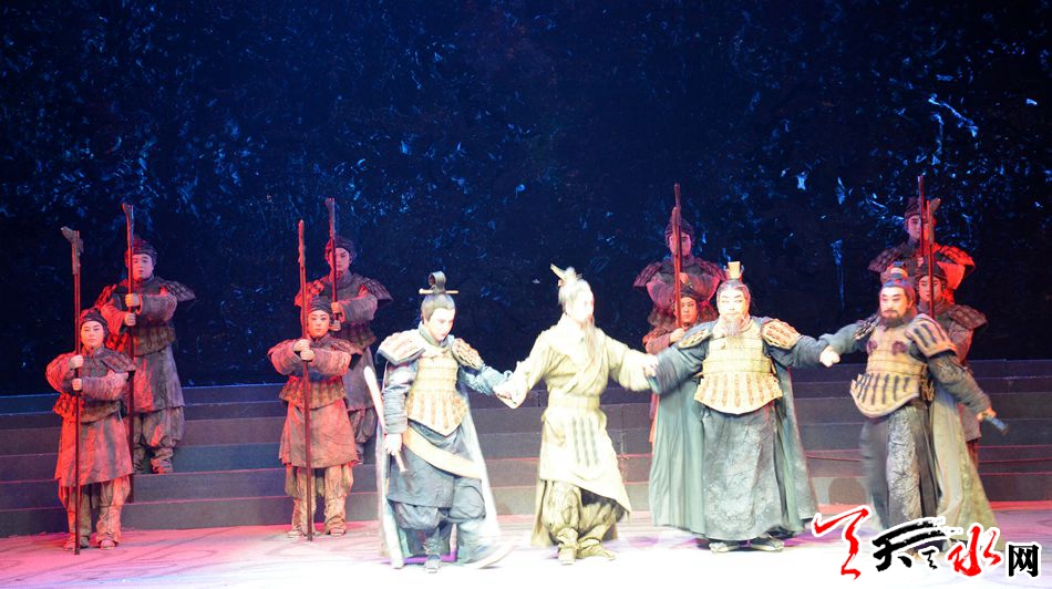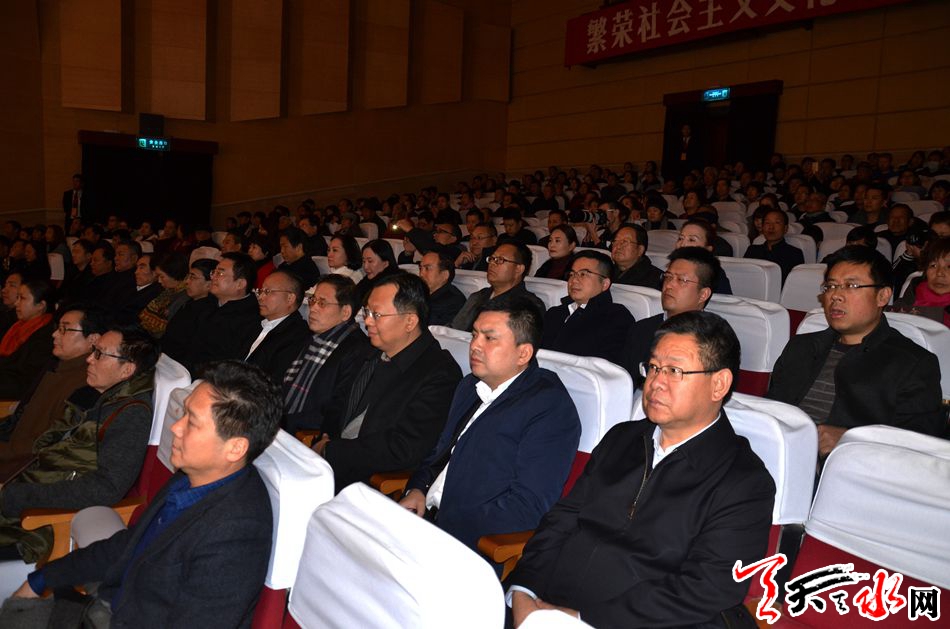 天天天水網(wǎng)西安訊【記者 何慧娟】12月16日晚,由甘肅省文化廳、甘肅省文學(xué)藝術(shù)界聯(lián)合會、中共天水市委、天水市人民政府主辦的“秦文化交流演出”在被譽為“秦腔最高學(xué)府”的陜西省戲曲研究院劇場激情上演,大氣磅礡、氣勢恢宏、蕩氣回腸的新編歷史秦腔劇《大秦文公》拉開了陜甘兩省文化深度交流的序幕。陜西省委常委、宣傳部長梁桂,陜西省文聯(lián)黨組書記、常務(wù)副主席吳豐寬,陜西省旅游局副局長郝占延,陜西省戲曲研究院院長李梅,西安市委常委、宣傳部長吳鍵,甘肅省文聯(lián)黨組書記、副主席周麗寧,天水市委常委、宣傳部長蒲軍,天水市政府副市長張建杰,天水西秦腔研究院院長董秦等以及西安秦腔愛好者500余人觀看了演出。