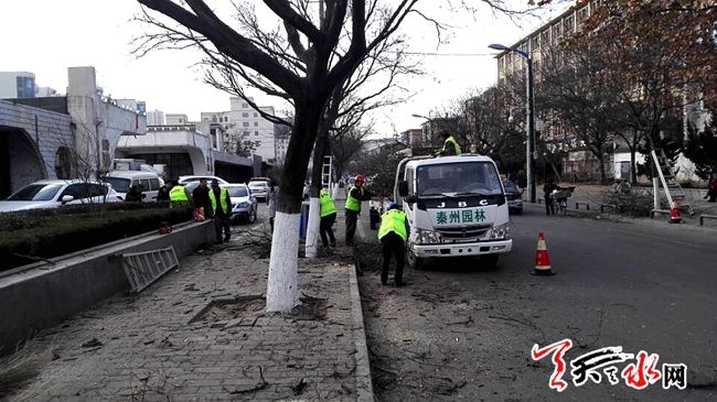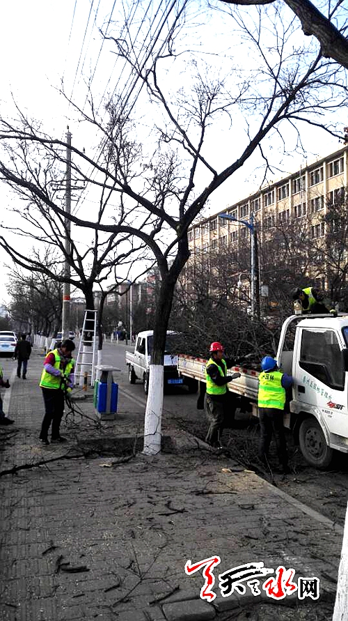 天天天水網(wǎng)22日17時訊 【記者 楊曉斌】秦州區(qū)永慶路,園林工人正在修剪行道樹。據(jù)了解,近幾天來,在樹木完全進入生長休眠期后,園林工人對行道樹進行全面修剪。經(jīng)過今冬的修剪,明春綻綠后的行道樹會更符合我市園林城市建設(shè)的要求。道路和城市會更靚麗。