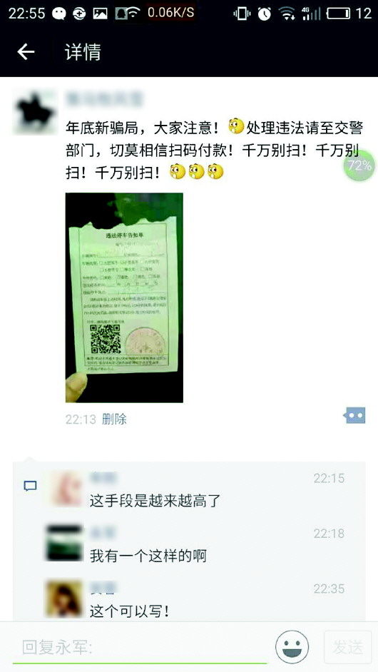 看看吧,騙子只需要用一個(gè)二維碼就能將您的錢輕松騙到自己的口袋里。所以,車主們一定要留心了,如果車上被貼了這種“罰單”,一定不要理會(huì)并在第一時(shí)間報(bào)警。