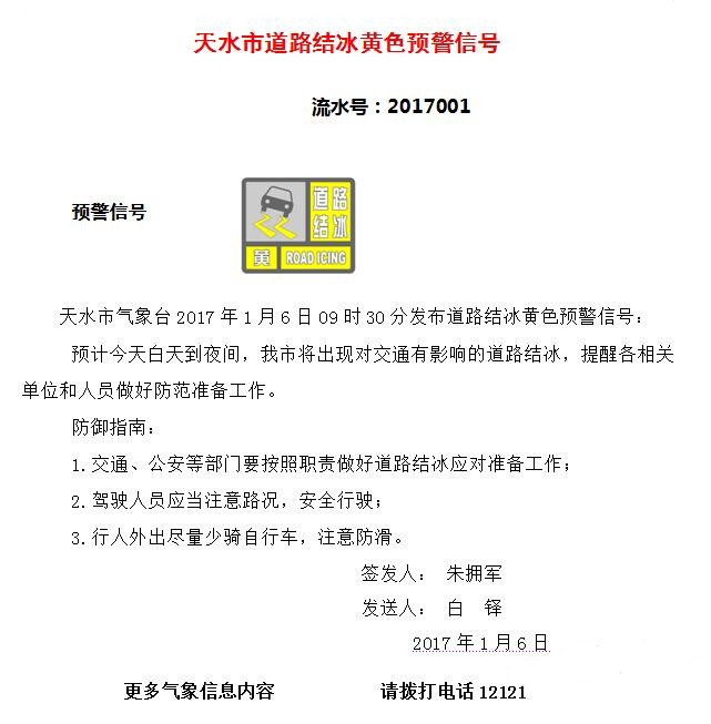 中國天氣網(wǎng)訊 天水市氣象臺2017年1月6日09時(shí)30分發(fā)布道路結(jié)冰黃色預(yù)警信號:預(yù)計(jì)今天白天到夜間,天水市將出現(xiàn)對交通有影響的道路結(jié)冰,提醒各相關(guān)單位和人員做好防范準(zhǔn)備工作。