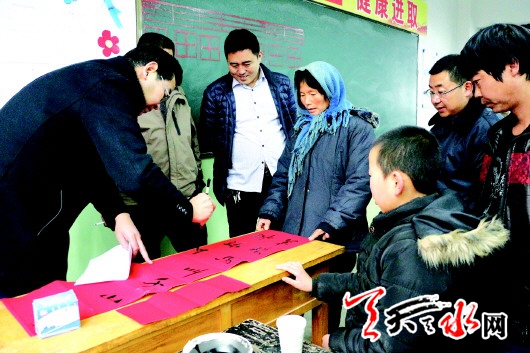 ??? 當(dāng)天,活動(dòng)組為當(dāng)?shù)厝罕娒赓M(fèi)書寫對(duì)聯(lián)、字畫,發(fā)放科技圖書,為他們普及農(nóng)業(yè)技術(shù)等方面的知識(shí),同時(shí),對(duì)當(dāng)?shù)匦W(xué)教師進(jìn)行義診并免費(fèi)發(fā)放藥品,讓群眾在大雪紛飛的寒冬里感到濃濃的暖意。市政協(xié)副主席蘇定武出席活動(dòng)并講話。
