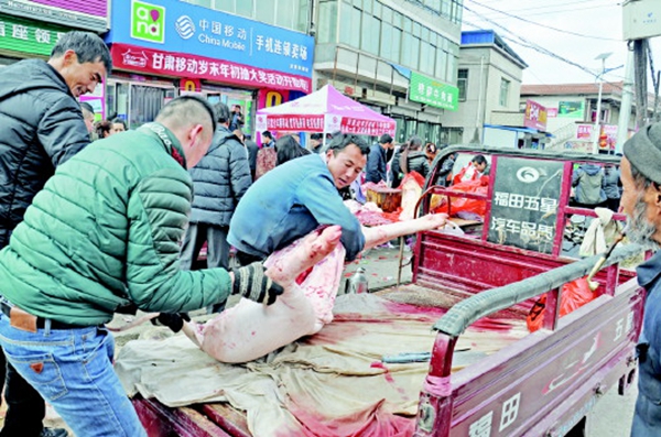 1月14日,農(nóng)歷臘月十七,麥積區(qū)甘泉鎮(zhèn)的逢集日,記者搭乘從麥積城區(qū)發(fā)往甘泉的班線車前往集鎮(zhèn)采訪。剛一到甘泉鎮(zhèn)路口,濃濃的年集景象就撲面而來,尤其是在古鎮(zhèn)牌樓下,一字排開的大肉銷售攤點(diǎn),推高著甘泉古鎮(zhèn)盛大的集市熱情。