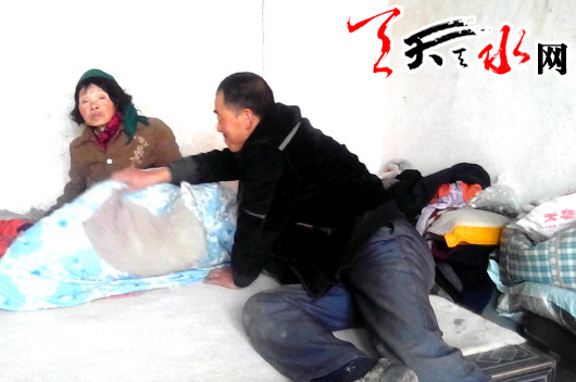接到反映后,記者趕到天水鎮(zhèn)董坪村采訪。走進(jìn)村民汪霞光家里,記者看到,一間蓋起才幾年的新瓦房里,一位年約七旬、衣著破舊且滿身污垢的老太太正在拖地。汪霞光走進(jìn)屋后,將老人扶到炕上,他介紹說(shuō),這是他的母親,今年已68歲了。