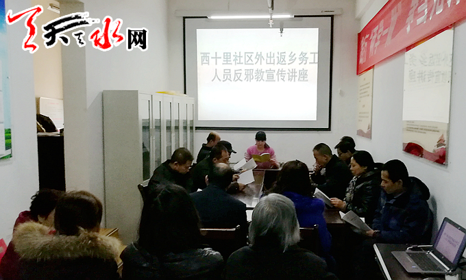 天天天水網(wǎng)訊(通訊員李小霞)春節(jié)將至,外出務工人員陸續(xù)返鄉(xiāng)歡度新春佳節(jié),為推動反邪教工作進一步深入開展。2017年1月20日,天水郡街道西十里社區(qū)在轄區(qū)范圍內(nèi)開展了外出務工返鄉(xiāng)人員反邪教警示教育宣傳講座。