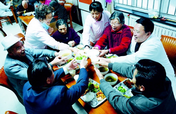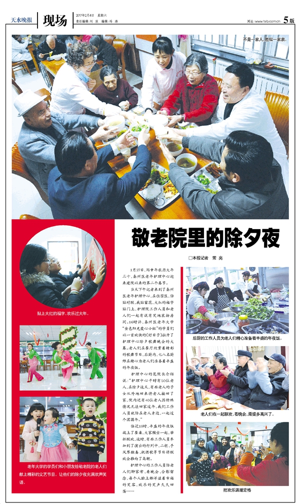????當(dāng)天下午記者來到了秦州區(qū)老年護(hù)理中心,在住宿區(qū),你貼對(duì)聯(lián)、我貼窗花,大紅的福字貼門上,護(hù)理院工作人員和老人們一起有說有笑地裝扮房間。16時(shí)許,秦州區(qū)老年大學(xué)“金色陽光愛心小組”的學(xué)員們以一首歡快的《好日子》拉開了護(hù)理中心除夕歌舞晚會(huì)的大幕。老人們?cè)诓蛷d欣賞著精彩的歌舞節(jié)目,后廚內(nèi),七八名廚師在精心為老人們準(zhǔn)備著豐盛的年夜飯。